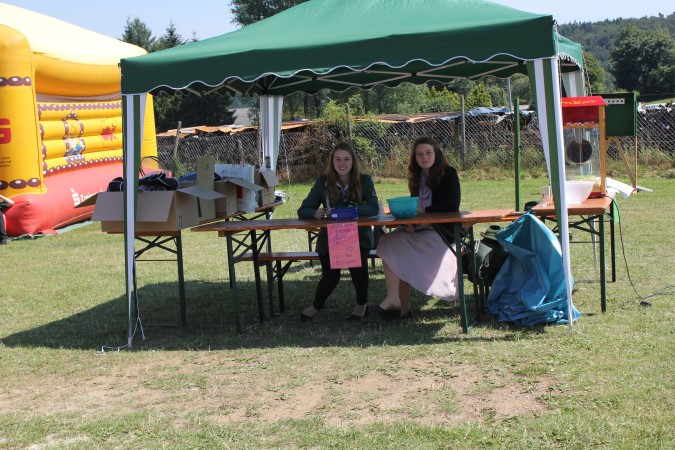 | Der Lasergeherstand mit Popcorn-Maschine ist aufgebaut |